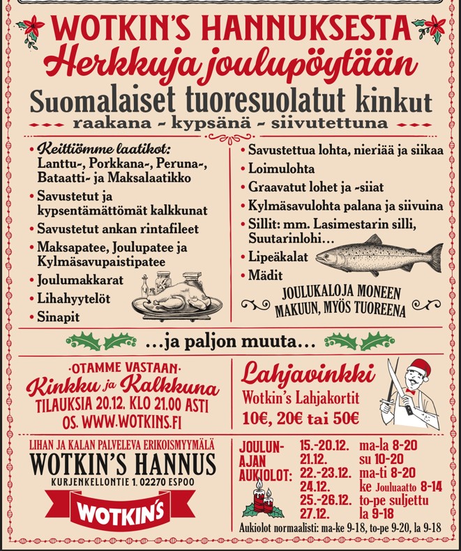 27-12. 9-18Otamme vastaan kinkku- ja kalkkunatilauksia tilauksia. Klikkaamalla linkkiä pääset tilaussivulle: https://www.wotkins.fi/kinkkutilaus/