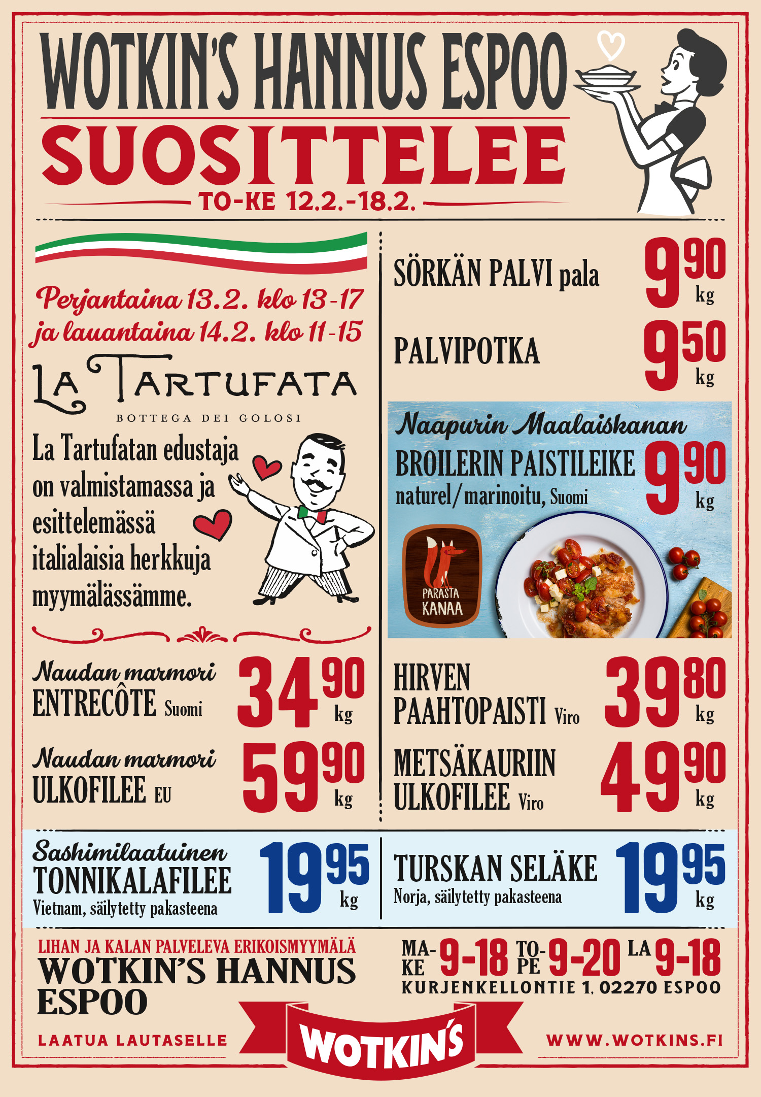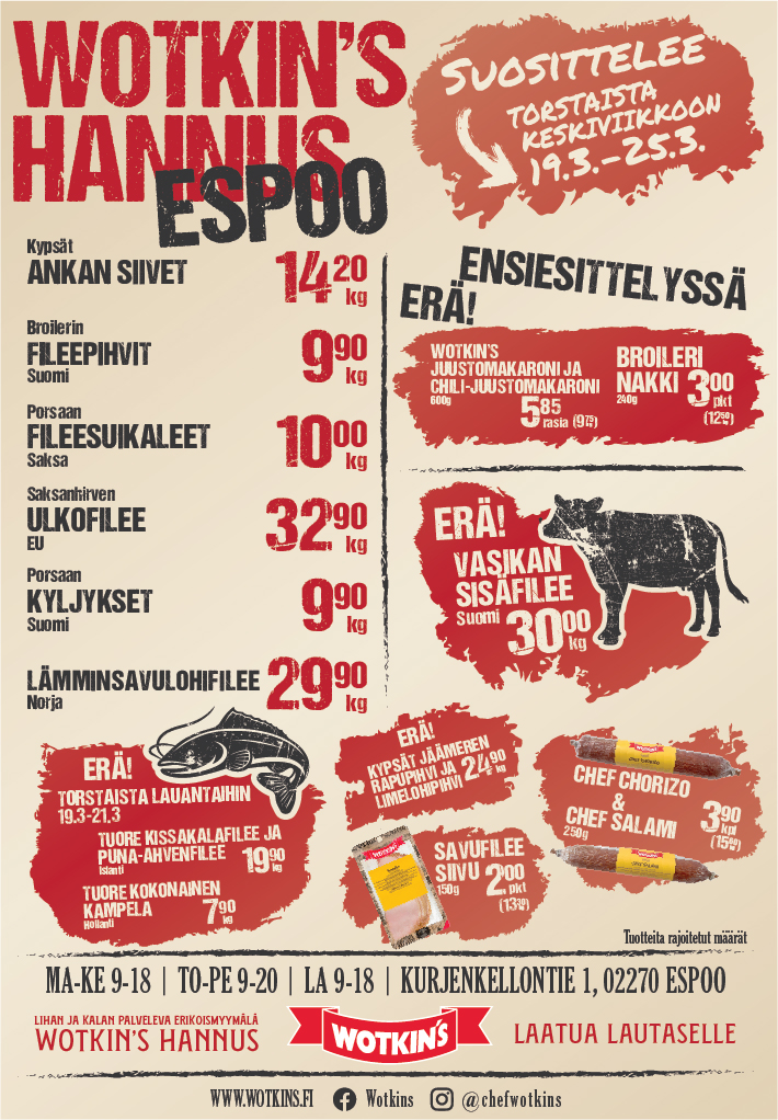 Espoon Hannuksen myymälämme palvelee maanantaista lauantaihin Lidlin naapurissa. Myymälästä löydät palvelevan liha- ja kalatiskin, korkealuokkaiset oman tehtaan jalosteet ja keittiön maukkaat kotiruoat. Sen lisäksi paljon muita uusia herkkuja.